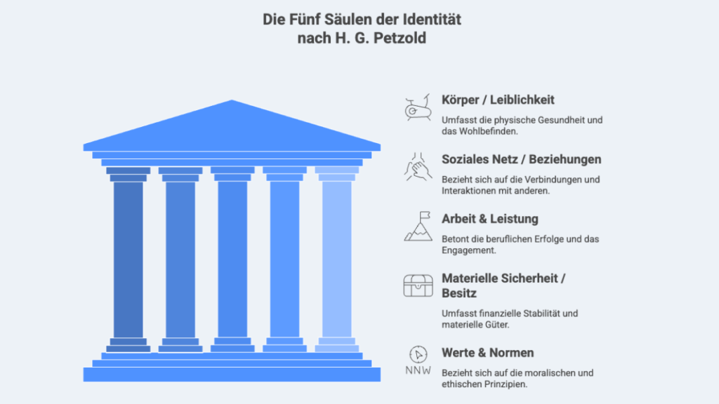 Nach Hilarion Petzold gibt es fünf Säulen der Identität und die Arbeit spiegelt sich in allen diesen Säulen wider.